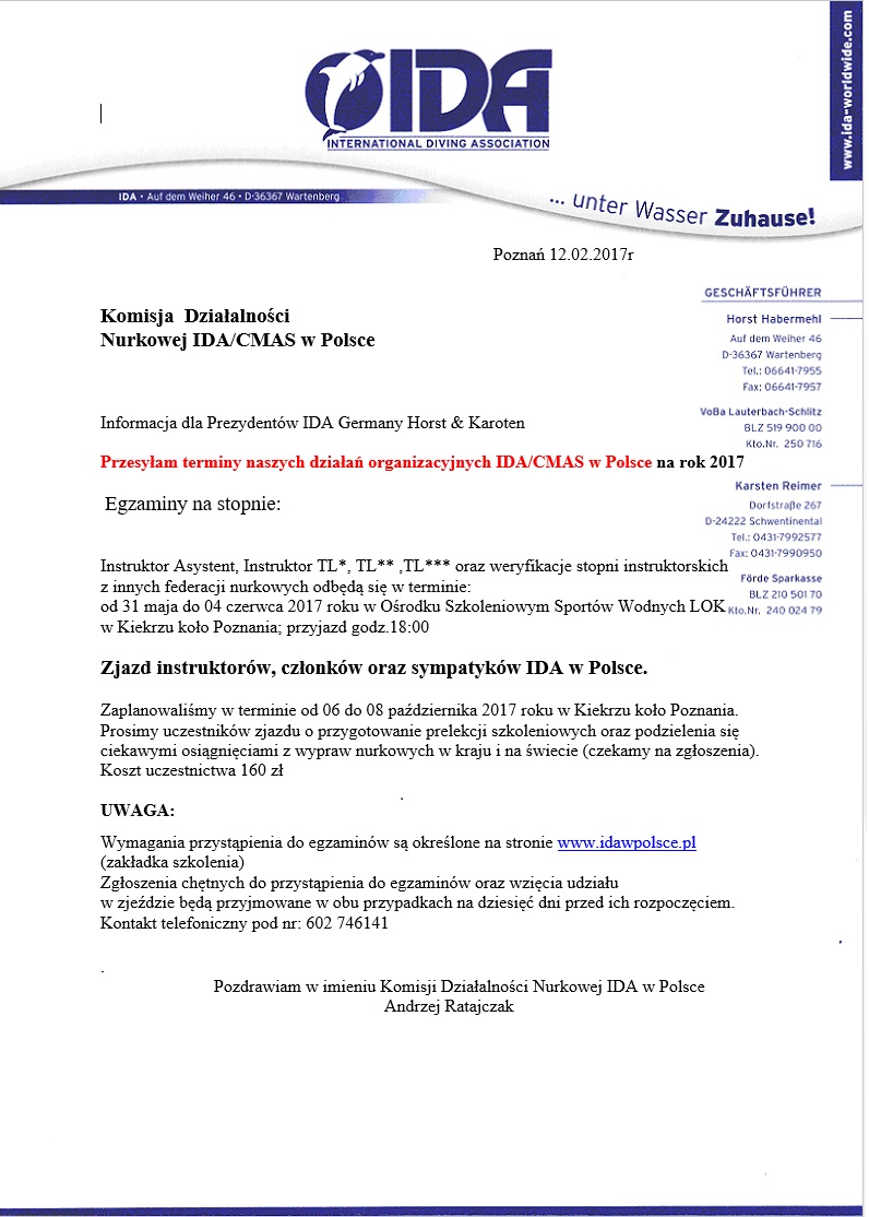 Informacja do instruktorów i członków IDA/CMAS w Polsce oraz do Prezydentów Horst & Karsten